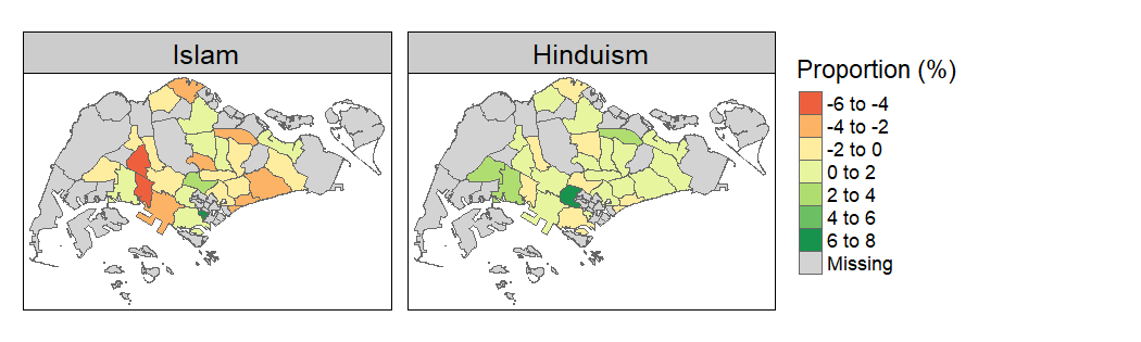 The if clause is used to deal with the need to handle contents with and without a secondary sub-division column (i.e. Level_2). As a follow up on the previous post examining the distribution of religious beliefs in Singapore, let us extract the religion related data and examine the changes across time. For consistency, I also create a composite Christianity group. As per the previous post, I visualise the changes on the current map of Singapore using the regions from the 2014 Master Plan.